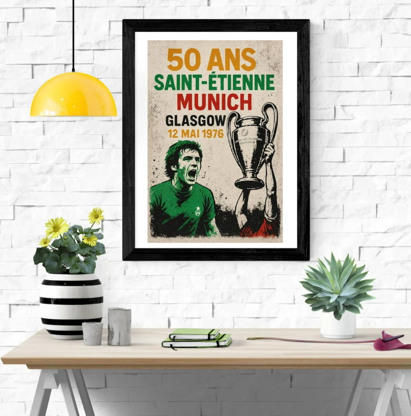Un visuel fort, mêlant nostalgie et modernité : les héros de 1976 face à face sous les couleurs de Saint-Étienne et Munich, unis par la Coupe d’Europe.